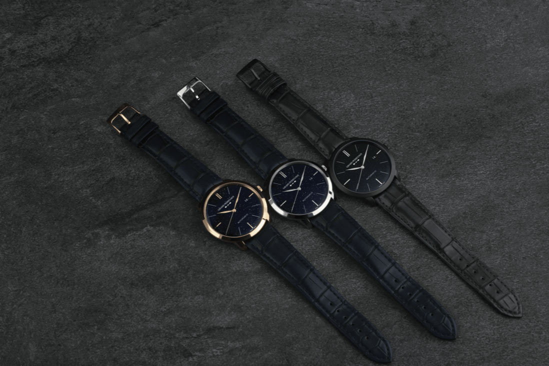 黑色和蓝色砂金石面盘採用拱状造型,增加深邃的立体感。亮晶晶的砂金石与表壳和指针上的银、黑、金色调形成鲜明的对比,散发1966系列特有的典雅韵味。不锈钢、DLC涂层不锈钢及玫瑰金三种材质则呈现一气呵成的三种风貌。