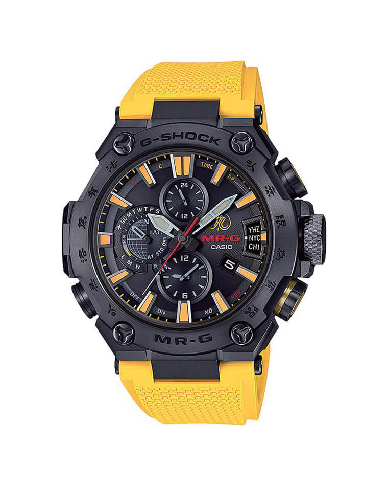 提到李小龙,很多人对于他在电影《死亡游戏》中所穿着的黄黑配色戏服都感到记忆犹新,黄黑这经典配色也成了G-SHOCK在设计MRG-G2000BL时的重要灵感依据,表款採用镀黑钛金属表壳,面盘上的细节以及橡胶表带则是採用黄色建构李小龙深植人心的印象,此外G-SHOCK也从李小龙自创截拳道流派Logo的配色中擷取红色来点缀手表面盘。一般MR-G系列的表圈只会在12点和6点方向刻上品牌名和系列名,不过MRG-G2000BL特别在表圈两侧刻上「以无法为有法,以无限为有限」的截拳道精神以传达李小龙的武术理念。