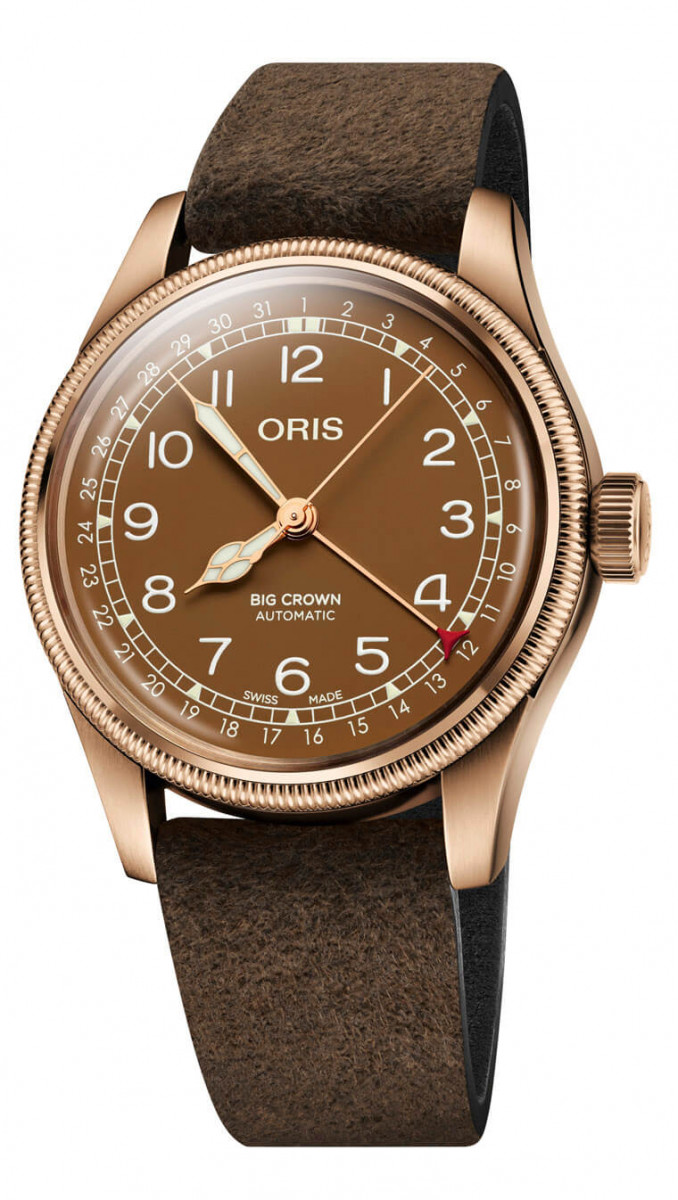 ORIS选择使用青铜搭配特殊加工处理,让每一个青铜面盘都显得独一无二,向Big Crown指针式日期腕表的经典历史地位致敬。手表焦糖色面盘搭配棕色麂鹿皮皮革表带,40mm实心的青铜表壳,搭配经过化学处理,并且涂上一层透明暗光漆的青铜面盘,为每一只手表都带来了独一无二的细节魅力,同时也展现了历史性的符号,及这款手表的设计直至今日所代表的独特地位。