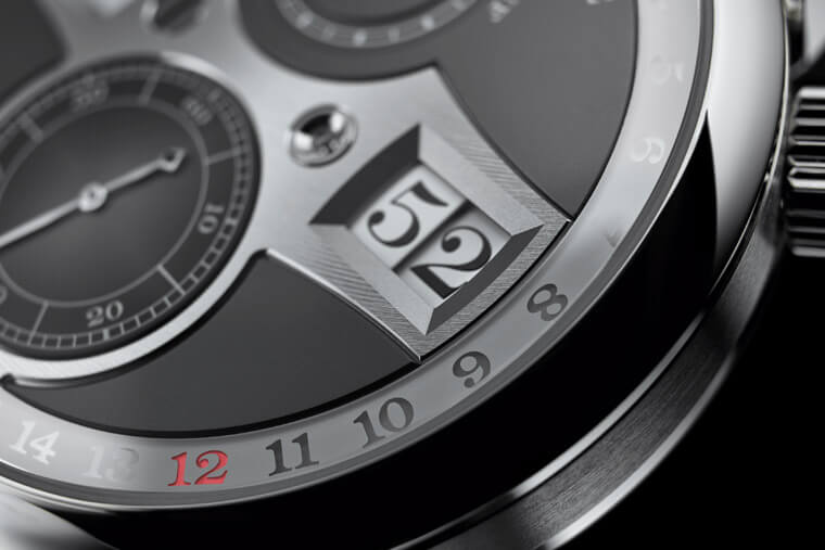 Zeitwerk Date是该系列首款具备日期显示的作品,你可能会认为朗格会直接在上头开设大日期视窗,但实际上考量到要维持Zeitwerk系列的基本架构,大日期窗是不太适合应用在这款表上的,因此在Zeitwerk Date身上我们会发现到它的日期显示是设在面盘外缘,不同朗格也不是使用指针搭配刻度,而是以玻璃印上日期数字之后,透过下方转盘的红色色块来指示当前日期,也就是当天日期看起来会是红字,其他时间平常看起来则是清一色的灰字。