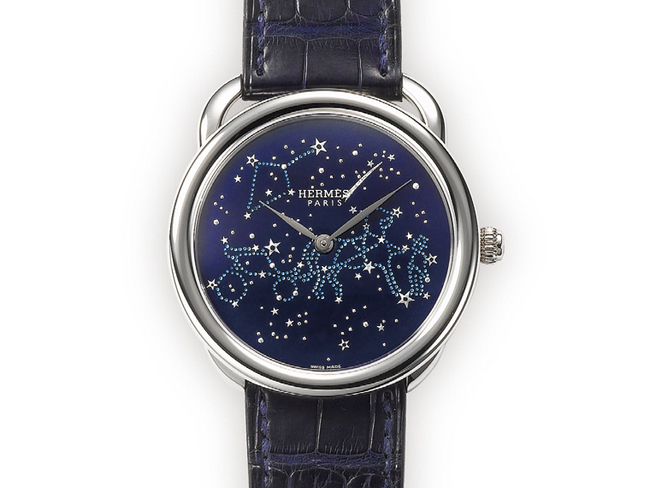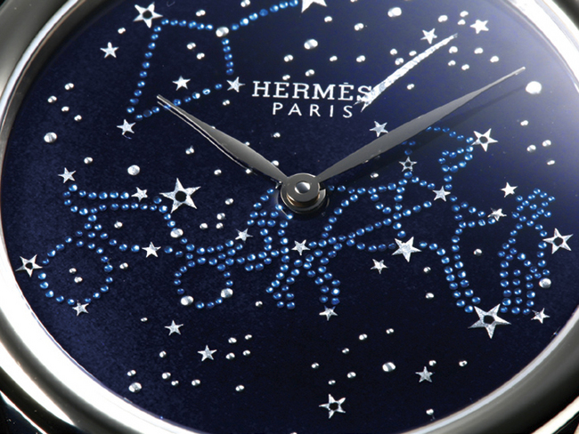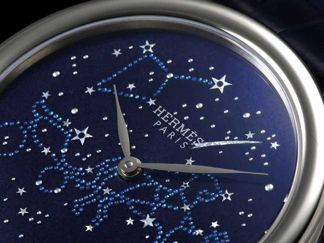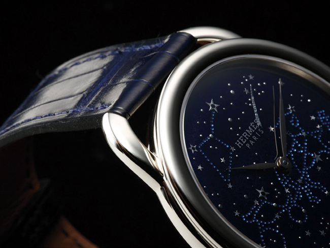 2012年爱马仕推出了好几款珐琅彩绘表,其中有手表也有怀表,主题多半是取自他们家的织品;这款比较不一样的是,它的面盘图案是来自爱马仕制作过的一只首饰盒。表款以大明火镶金珐琅的手法重现这帧图案,它先在金质的底盘上雕出圆点,排列成马车和星座等等图形,再在上面填上透明蓝色的珐琅加以烧制,烧成后图形会隔着珐琅透出来;除此之外在烧制的过程中还会将星形、圆点状的金箔嵌在珐琅面上,让成品的图案有不同顏色、不同层次的立体感。严格来说这款用上的并不算顶复杂的珐琅技巧,不过表款本身的完成度却可能还高过一些一味炫技的作品。