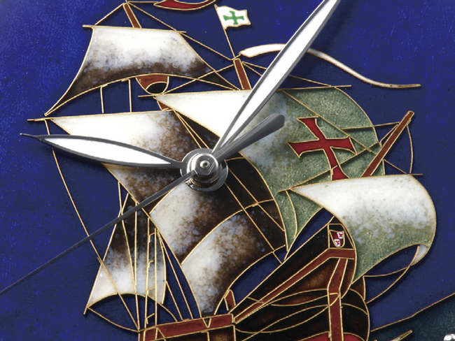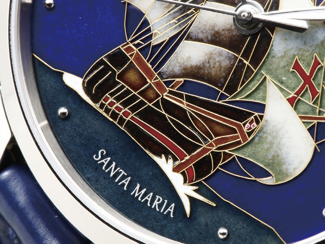 船上的每一片帆都做了顏色的深浅变化,层次自然,呈现出很好的光影和立体感;6点鐘位置有"SANTA MARIA"的字样,不过这个应该不是掐丝,而是之后写上去的。