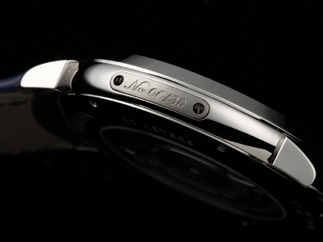 一本雅典表的惯例,表壳侧面镶有铭版,注明了表款的限量数字和流水编号;本款限量30只。Classico系列的表耳也很有特色,从表壳的线条外突出一个角。