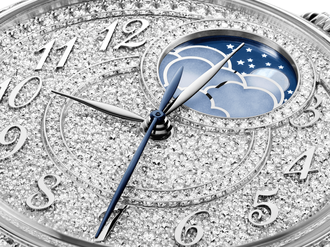 ▲专为该系列设计的手写斜体数字,让人联想起精美的刺绣,月相显示盘被璀璨的钻石环绕,而柳叶形时针和分针则呼应了高级订制时装裡于指间灵活穿梭的细针。