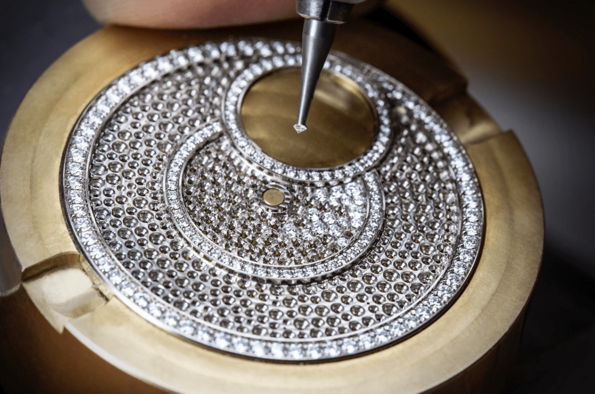 ▲手表搭配直径37毫米的白金表壳,表壳、面盘及表链上共镶嵌1,344颗明亮式切割钻石。