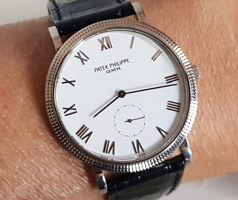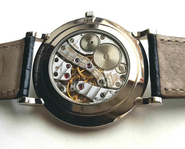 ▲这款据说为唯一採用透背的3919,特别之处像是指针与罗马数字时标均为白K金材质,面盘设计优雅雋永,是PP的经典不败款之一。