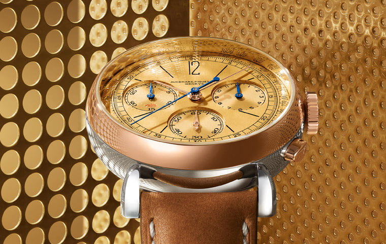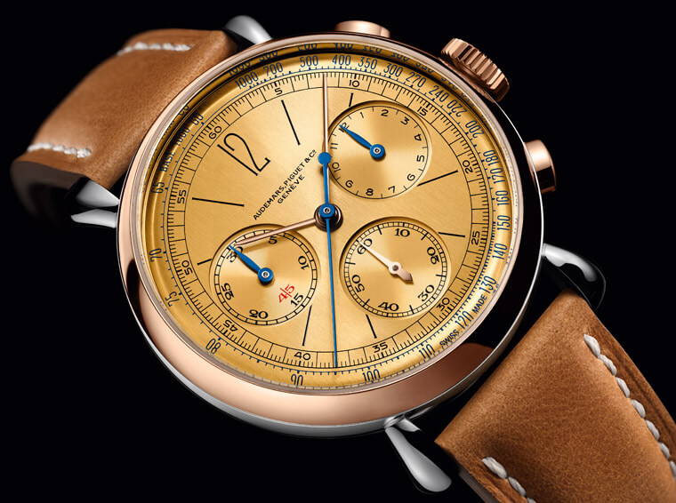 眼光移至[Re]master01的面盘,它那特别经过打磨的黄金面盘与表壳的半金组合形成丰富的视觉色彩层次,面盘的细节如外缘设有移印的蓝色测速计刻度、黑色时标,搭配玫瑰金时、分与小秒针,另外计时指针则是经过蓝钢处理以与走时指针做出区隔。此外面盘12点方向移印的品牌字样也很有「时代感」,有别于现代爱彼手表系列所放的品牌Logo,这款表印上的字样乃是”AUDEMARS PIGUET & Co GENÈVE”,从中可以看出品牌早期经营公司的策略(据说当时印上日内瓦字样对于手表经销有实质功用),这点也再次强化了[Re]master01发扬古董表精神的核心概念。