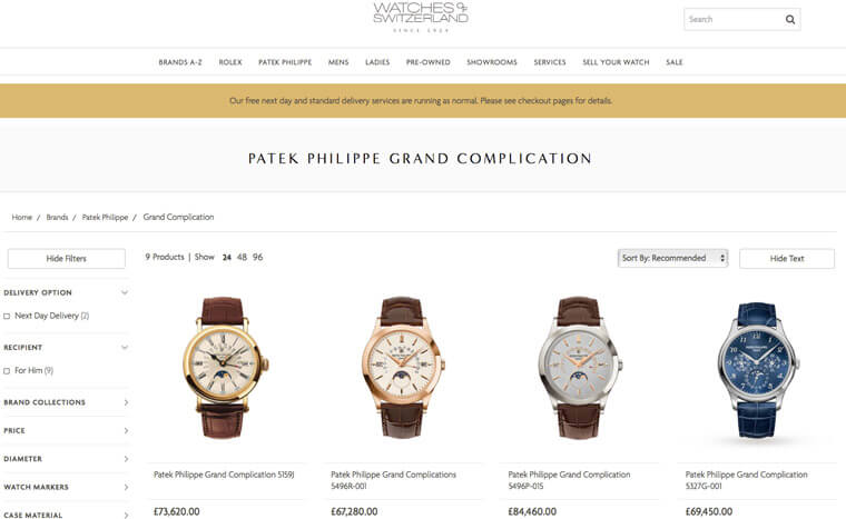 ▲目前开放线上购物的AD店主要集中在英国,几家知名表店如Watches of Switzerland或London Jewelers最近都可以在线上买到部分百达翡丽手表了。图片:watches-of-switzerland.co.uk