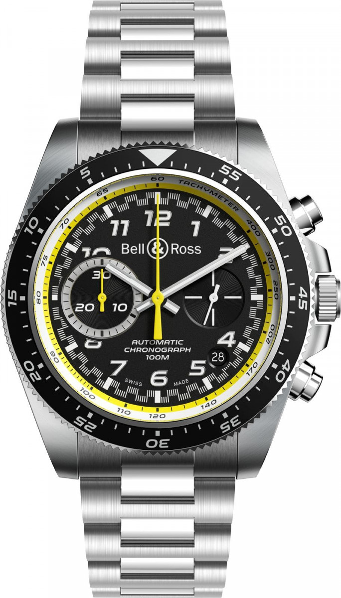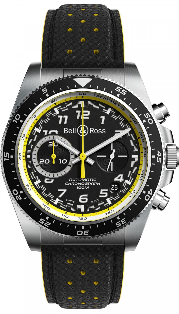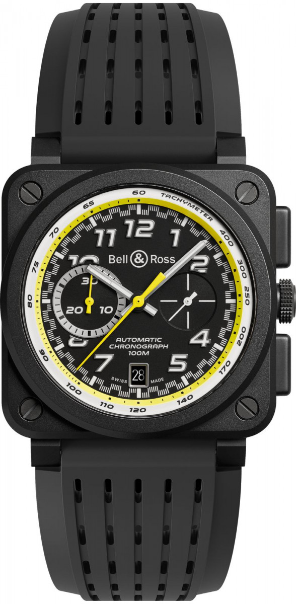 而另一款BR 03-94 R.S.20採用品牌标志性的方形表款,该款计时码表同样限量999只,雾面黑色防磨损陶瓷表壳,搭配黄色的计时功能提供的所有资讯,让手表非常有赛车感。凸缘上带有速度计,被分为两个区域,分别採用不同顏色。计时功能的分钟轨道设于镀銠黄铜环上,保证极佳易读性。