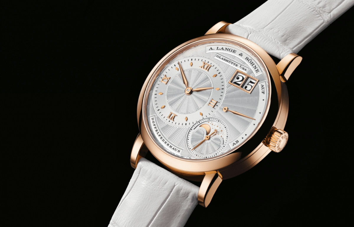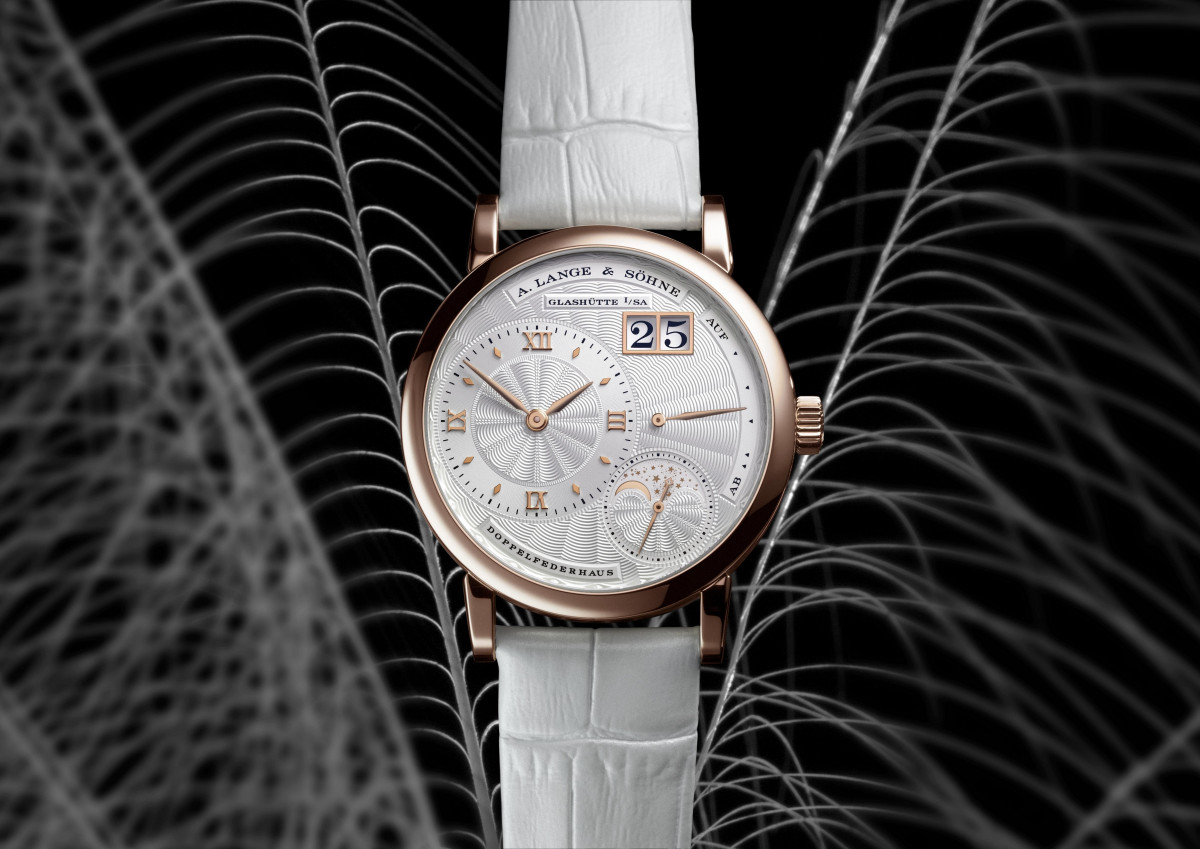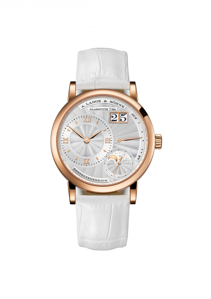 Little Lange 1 Moon Phase的天文复杂装置准确模拟了月相周期,每隔122.6 年才需校正一天。18K玫瑰金指针和嵌块刻度令不对称表盘及其精确瞬跳大日期显示更突出。手表直径36.8 毫米,佩戴于女性的手腕之上恰到好处。另一版本镶嵌56颗明亮式切割钻石,有如群星拱月,同样高贵大方。