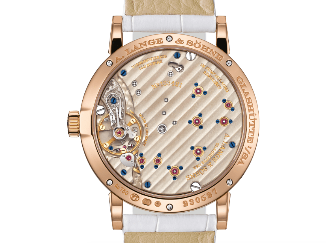 手表搭载的L121.2手动上链机芯以经典Lange 1机芯为蓝本,备有双发条盒及自制游丝等特色。Little Lange 1 Moon Phase的机芯经手工细致修饰,与面盘上的完美外观一样,值得细致欣赏。