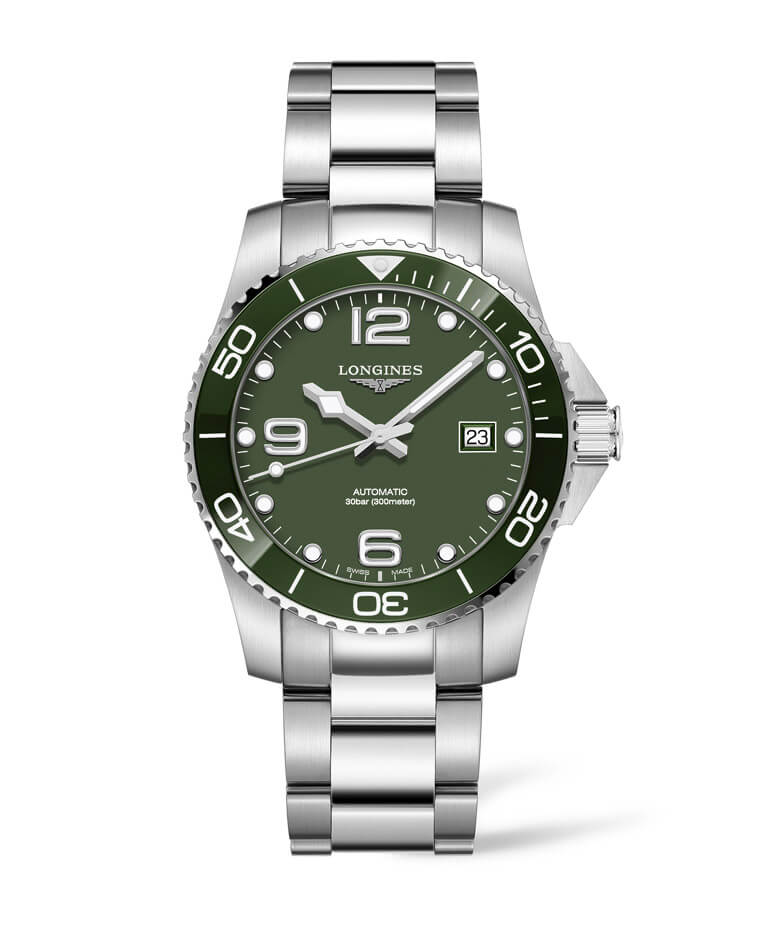 浪琴2020年推出的HydroConquest是系列之前没出现过的军绿色。随着绿浪鬼一出来,这下还在考虑要买哪种顏色的人又有得烦恼了。这只浪鬼依旧是不锈钢材质搭配绿色陶瓷表圈,同时包括面盘和橡胶表带也都延续表圈的顏色,让这只表看起来更和谐统一,除此之外,新世代浪鬼在设计上的特徵如表圈仅前15分钟有刻度可以作为下潜时间的提示,而面盘的刻度与时标配置也趋于精简(移除掉过往圆形时标上方的梯形时标),另外秒针尖端也加上了夜光显示,藉此提升手表的夜视效果。