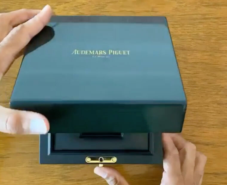 表友在开箱影片中首先打开AP的绿色表盒,皇家橡树表盒的外型还满朴实无华的,开盒后裡面表层也没有其他的附件,直接就是诱人的15500ST.OO.1220ST.01正对着表主,不过看看表盒裡面的皮革,质感似乎挺好的,手表固定在表枕上也不会乱跑。