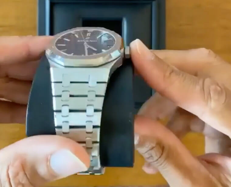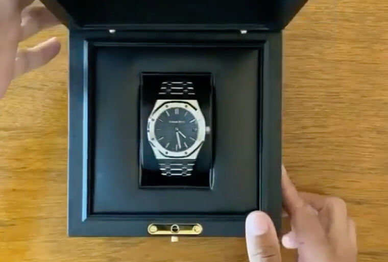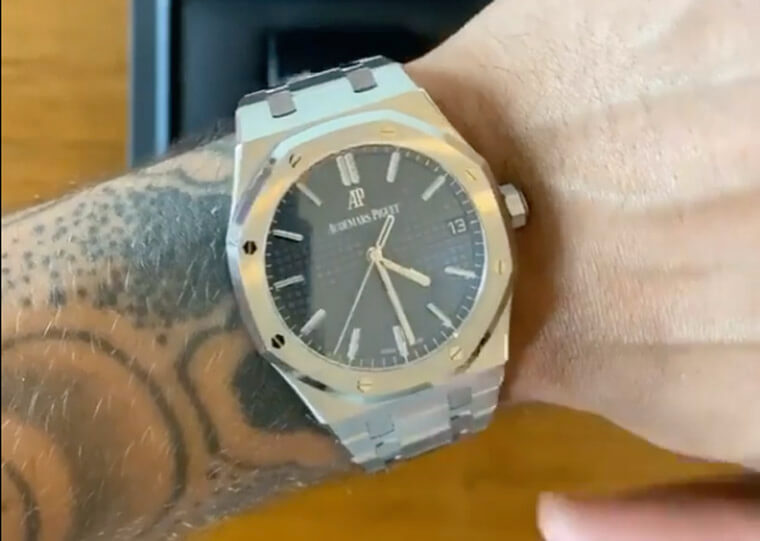 就在表友将手表从表枕取出后,下一个步骤不用多说就是试戴啦,看起来41mm的表镜戴在这名表友手上算是非常刚好,而当他扣上折叠扣后,手表也展现出长度适中的服贴度,表头在手腕上不会上下滑动,可以让人戴得很安稳放心。看着表友大方分享他的开箱影片,想必他个人对于能入手15500ST.OO.1220ST.01也是非常满意,在此遥向他贺成交,恭喜他入手了一只既经典在市场上又炙手可热的优质名表。