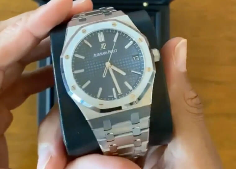 有表友在Instagram上分享了自己购入不锈钢皇家橡树大三针(15500ST.OO.1220ST.01)的开箱影片,从手表外观细节可以看出表友入手的是新款的RO,从品牌Logo位于12点方向以及面盘具有时、分、秒针可知它是41mm的版本,而非39mm的Jumbo超薄表,而从3点方向的日期窗「吃掉」位于该方位的时标这点来看,也可判断出手表是搭载爱彼新生代4302机芯的版本。