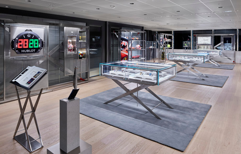 Samuel Ross此次主要以混凝土(矿物材料)和钢铁(工业材料)来表达宇舶的创作精神——融合的艺术(The Art of Fusion),此外设计师也从品牌近年研发有成的透明表壳作品中获得启发,打造出线条交错建构的超大型装饰,在宇舶尼翁表厂三楼的展场空间中,可以看到Samuel Ross主要是以极简线条搭配单色调的展场设计来烘托宇舶手表以及品牌大使等鲜艳丰富的视觉印象。