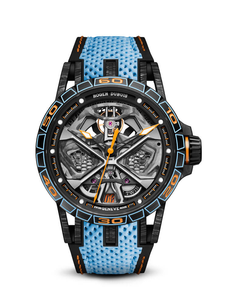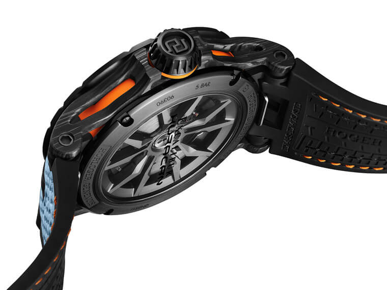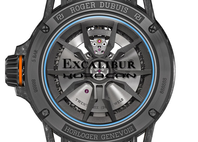 Excalibur Huracán STO採用碳纤维与黑色DLC钛金属制作表壳,虽然手表表径有45mm大,但是品牌採用的两种材质都是以轻量化着称,这点完美呼应Huracán STO的超轻车重特色。此外它的中层表壳也涂上了橘色,藉此与车款上的橘色细节互相呼应。另外罗杰杜彼还在表圈上的刻度加上蓝色边框与橘色阿拉伯数字,这些也都是受到同名超跑的启发。