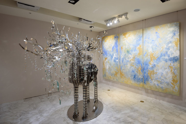 以不规则型塑、开枝散叶的鹿角吊掛数个透镜及水晶,欲串起观者感受致敬时间的艺术展现,而墙上随音乐起舞般的在画面上恣意张扬窜动的色彩,则能让人在观览之餘带来丰盈的满足感。