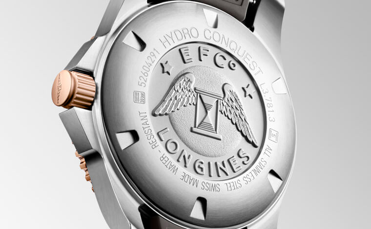 ▲底盖刻有象徵浪琴的飞翼沙漏标志,底下包覆的L888.5机芯属于硅游丝版本,整体性能更令人放心。