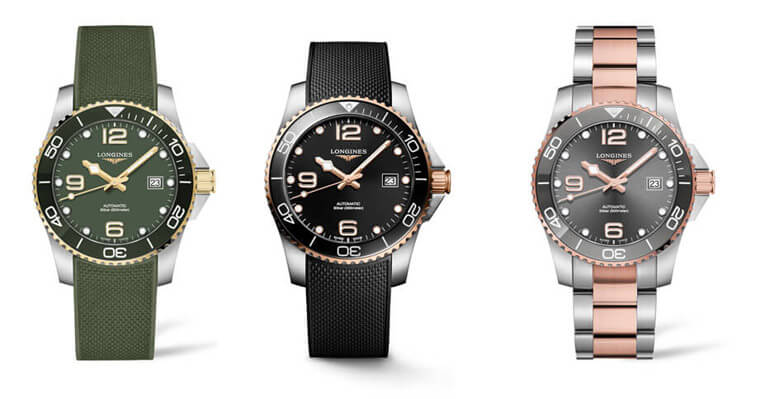 LONGINRS浪琴表的HydroConquest深海征服者因为不错的品质、与劳力士水鬼略微神似的造型而博得了浪鬼的美名,是不少人入门机械表时公认的优质之作。2021年浪鬼继不锈钢款和黑陶瓷款后迎来不锈钢与玫瑰金/黄金PVD双色版本,让系列款式更趋齐全。HydroConquest系列中的绿、黑与蓝面表款此次提供不锈钢搭配黄金PVD双色版本;而灰、黑与蓝色表款则提供不锈钢搭配玫瑰金PVD双色版本,手表可选择搭配与面盘同色的橡胶表带或双色链带。