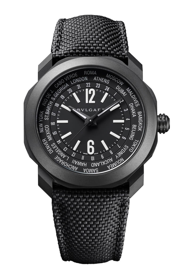 宝格丽新推出的Octo Roma WorldTimer分别有不锈钢表壳搭配不锈钢链带和蓝色漆面面盘版本,以及DLC不锈钢表壳搭配黑色橡胶表带与黑色喷砂面盘版本两款,它们的面盘设计最明显的改造在于多了面盘外缘的24 座城市环以及24小时刻度,也就是一表在手,佩戴者可以同时掌握从罗马、萨摩亚、安克拉治再到维德角等世界不同时区的当前时刻,当然最重要的当地时间更是在面盘最内圈上一目了然。
