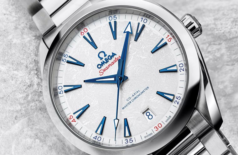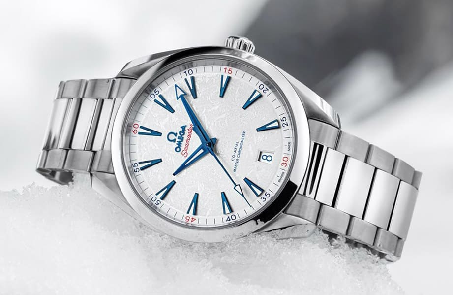 一般版Aqua Terra面盘都採用水平甲板纹装饰,不过冬奥特别版为了突显主题性,直接把甲板纹改了不规则的白色纹理——看起来是不是有点像置身雪地时的样子。而与SEIKO手表会出现的雪花面盘那种採用半透明涂层并将面盘施以冲压形成纹路的做法不同,欧米茄是在白色陶瓷面盘上以雷射雕刻的方式制造出类似雪地的立体起伏效果,而且品牌也顺着雪景这样的脉络,替面盘搭配蓝色的时标与指针,只有15、30、45和60等分钟刻度换上带有欧米茄印象的红色,除了以营造冰天雪地面盘风格的方式呈现之外,手表正面再无其他与冬奥相关的元素,好处在于这让手表不会有太强烈的时效性。