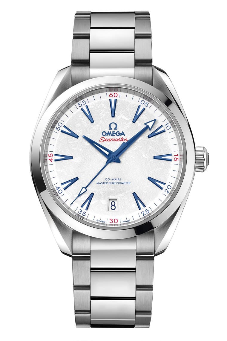 Aqua Terra「北京2022年冬季奥运会」特别版表壳同样是亲切好入手的不锈钢材质,这款特别版属于Aqua Terra家族中表径最大的41mm,它的整体造型包括链带设计大致都与一般版无异,然而毕竟它的身份比较不同,因此欧米茄也就破题的直接选择重新设计手表面盘样式,让Aqua Terra「北京2022年冬季奥运会」特别版一看就与一般版有着明显的区隔。