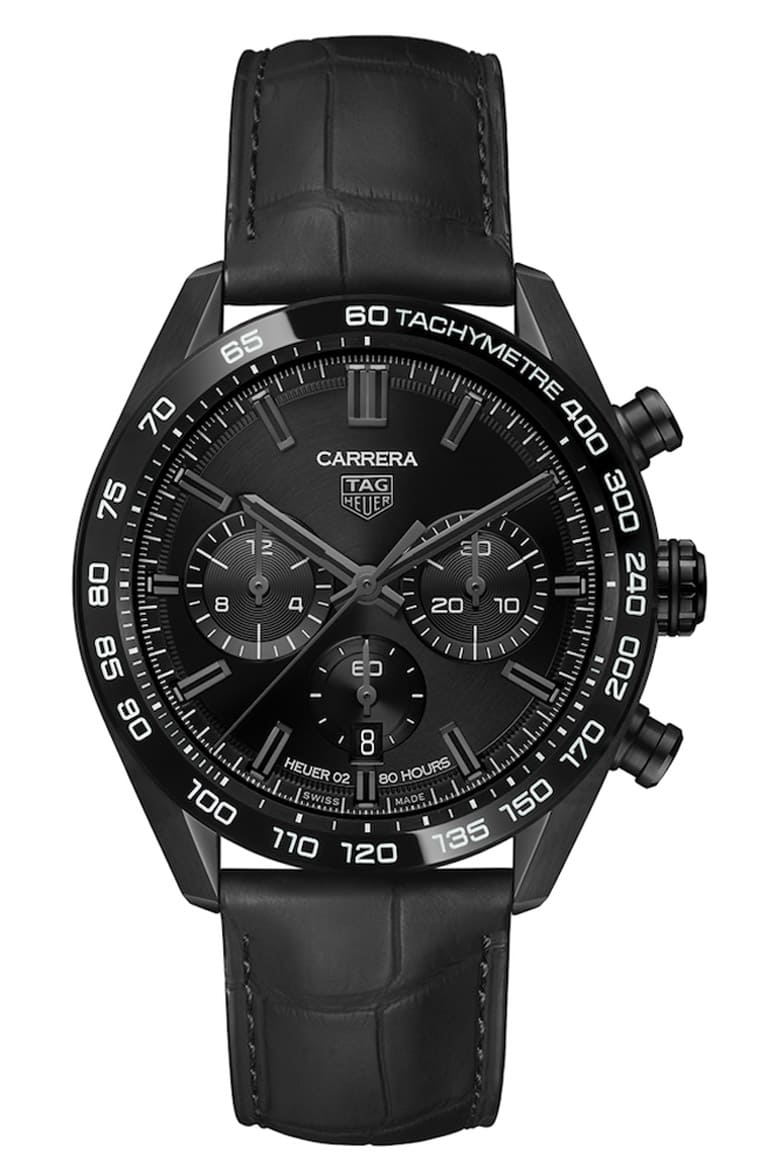 表款的44mm表壳属于不锈钢材质,之所以外观会一片黑是因为泰格豪雅运用黑色DLC涂层,搭配黑色鱷鱼皮表带,包括折叠扣也都经过DLC镀黑,可是说是黑得很彻底。Carrera H02湛黑版限量计时码表的黑色表圈为耐刮坚硬的陶瓷材质,上面的测速计刻度填上白色让刻度易于判别。至于面盘方面也是贯彻同样黑的意念,连时标与指针都是黑色的,营造出低调沉稳的气质。