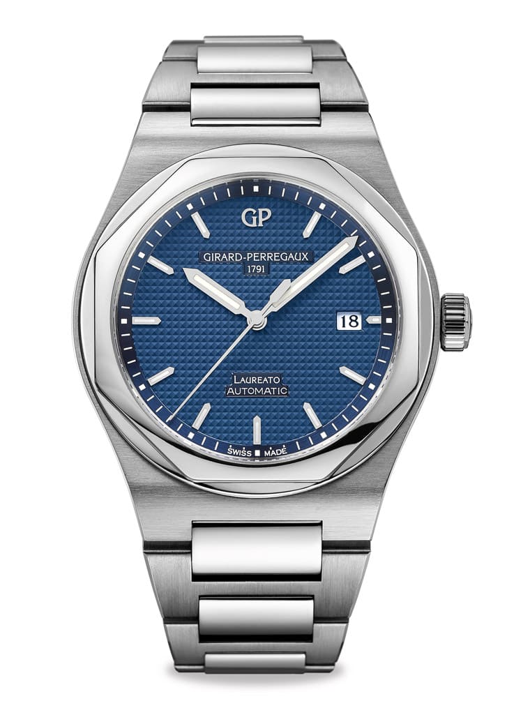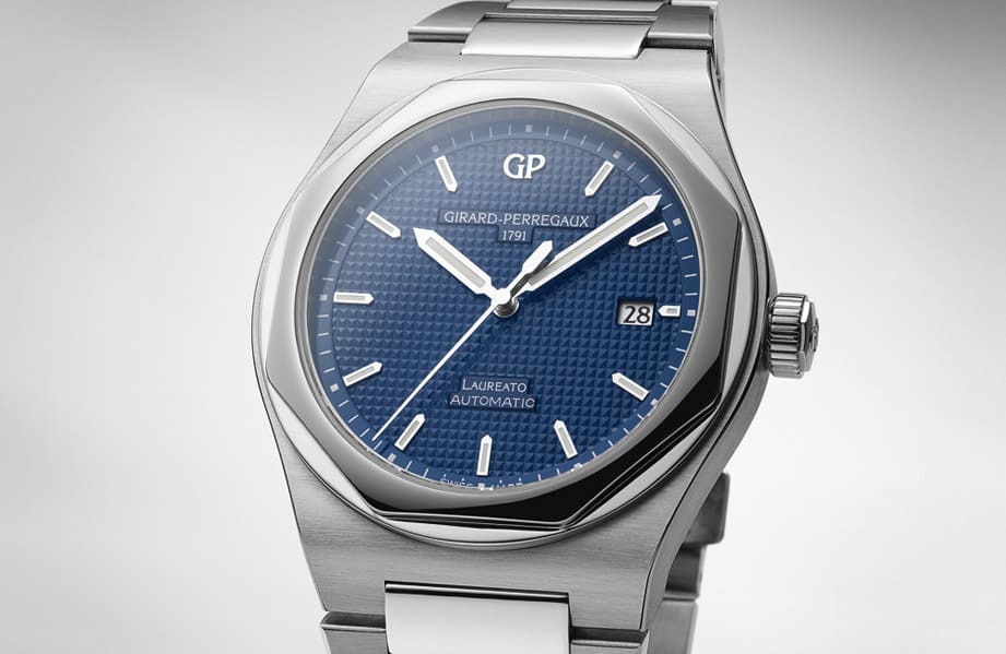 回顾Laureato的历史,它诞生于1975年,当时由于AP的皇家橡树崛起,因此Laureato也以高级运动表款作为定位而出现,而其较为纤细的八角表圈与一体成型的表带成为Laureato的正字标记。手表的八角表圈灵感来自义大利佛罗伦斯圣母百花大教堂的八角屋顶,而且GP在许多设计细节中加入了自家的DNA,譬如Logo所放的位置,就是取消了十二小时的时标,将GP Logo直接摆放在上方呈现一派大器感,而指针的部分,也刻意採用与时标一样的剑形造型,使表款整体风格的连结更为明显,还有加上面盘的巴黎钉纹,其能加强面盘的层次感,使得这大三针的朴实外型兼具细腻的风格化设计,这洗练的外型可是GP经过数十个年头承传至今的历史内涵。42mm的Laureato三针搭载GP01800自动机芯,它是由GP自主生产、设计与组装的机芯,具有54小时动力储存,震频为21,600vph,由191枚零件组成,从表背透明底盖可以看见机芯上美丽动人的日内瓦波纹,以及摆轮的精妙作动,机芯作工修饰符合市场对高级表的期望。尤其是它的定价几乎只有皇家橡树的一半,无形中提升了手表在市场上的竞争力。