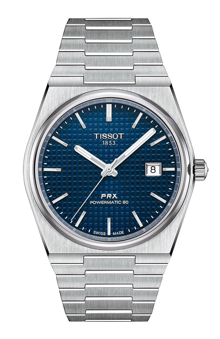 最初的PRX手表也是诞生自1970年代,不过当时它是一款石英表,天梭2021年先是复刻了石英机芯款,不久后又进一步以其基础的招牌机芯Powermatic 80衍生出让表迷眼睛一亮的机械机芯款。天梭为了要区隔两种机芯版本,因此在PRX石英款上採用与原版相近的单色太阳放射纹面盘,至于搭载自动机芯的款式则是改成类似皇家橡树的格纹装饰,而虽然两种机芯款式的时标与指针造型大同小异,不过机械机芯款式位于3点方向的日期窗多加了金属边框、6点方向”PRX”字样下方也新增机芯名称,这些小地方能让两种机芯款式更快速能被一眼辨别。除了询问度最高的蓝面之外,PRX Powermatic 80另还有黑面以及银面,尤其后者的表圈还特别镀上了金色,提供相对丰富的选择。表款搭载的Powermatic 80是以2824-2为基础改制的,不过天梭将机芯震频由2824的28,800vph降低到21,600vph,由此解决了一部份扭力不足的问题,此外机芯的动力储存一举提升至超过3日这点也很吸引人,品质与实用性以入门机械表而言非常诱人,就算机械机芯款式的价格将近是石英款式的一倍,不过约两万台币左右金额还是相对容易负担,因此成为今年入门机械表裡具有高询度的人气款之一。