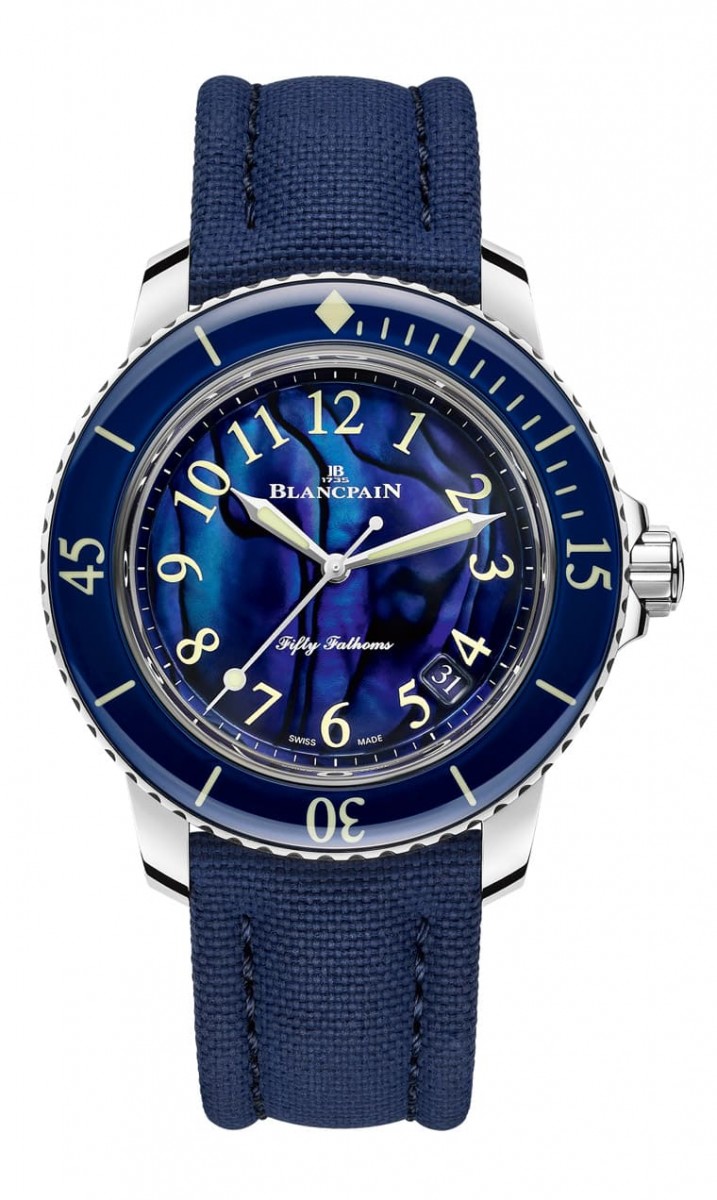 新款五十噚潜水自动表40mm採用不锈钢材质,搭配蓝色蓝宝石表圈以及蓝色航海帆布表带展现系列与大海的深厚渊源,以上这些设计都与一般的五十噚差不多,不过眼尖的人可能会先注意到表圈上的阿拉伯数字刻度字体好像跟以往的五十噚不同了,这也带出了手表面盘的新创意。宝珀採用墨西哥的天然珍珠母贝制作手表面盘,这可是系列首度融入珍珠母贝材质作为面盘主体,且品牌也颠覆传统以全阿拉伯数字时标取代五十噚招牌的棒状及圆点状时标组合。珍珠母贝染成蓝色有个好处在于它能破除性别刻板印象,加上手表表径又是比较刚好的40mm,因此男女性佩戴都很适合;还有一个小巧思在于时、分指针维持五十噚的标准造型,但是秒针却又是移植自Bathyscaphe系列的棒棒糖针,散发一种集大成式的感觉。