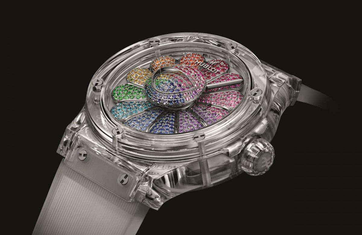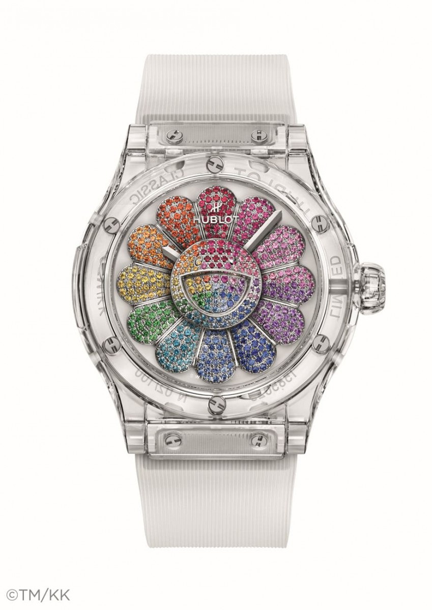 ▲继经典融合系列村上隆联名表后,宇舶在2021年年尾再接再厉推出第二代作品经典融合系列村上隆蓝宝石彩虹表,手表换上透明表壳并镶上彩色宝石,视觉惊艳度比起前作有过之而无不及。