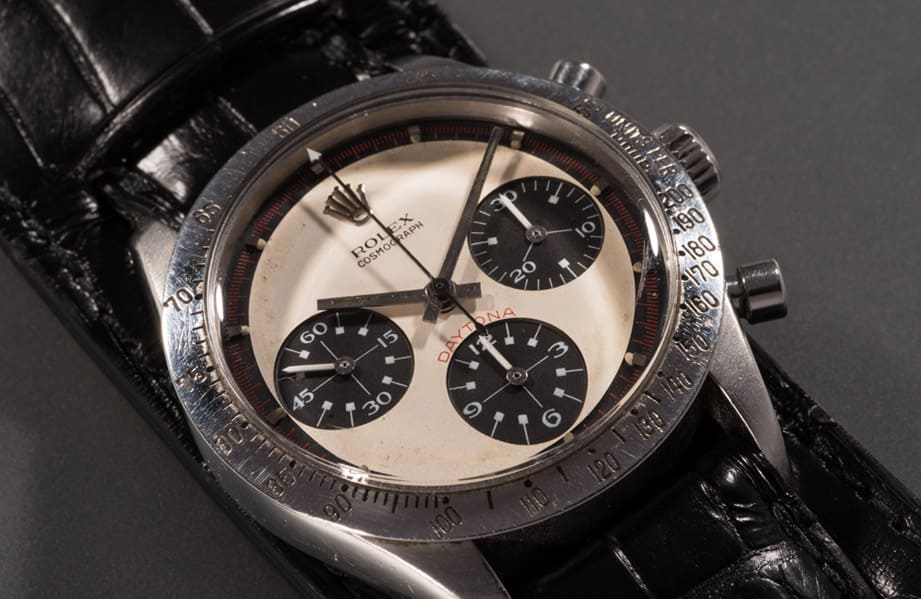 2017年富艺斯举行的一场纽约手表专拍,好莱坞已故影星Paul Newman曾拥有过的一款Daytona Ref. 6239成功超车前一年PP的Ref. 1518,荣登当时的手表身价王。这款Ref. 6239是保罗纽曼生前最常佩戴的一只爱表,再来表款本身的设计也有亮点,像是它三眼小表盘上的刻度字体採用了艺术字字型、而这些表盘上的刻度末端也都带有一个方型装饰,同时它面盘外围的刻度圈无论是用色或是设计都与一般版有所差别,这些细节上的独特性使它在Daytona家族中显得尤其珍贵。翻开表背还可以看到当年Paul Newman老婆Joanne Woodward委託品牌特别刻上的「DRIVE CAREFULLY ME」(小心驾驶,亲爱的)字样,证明这曾经专属于Paul Newman个人所有。