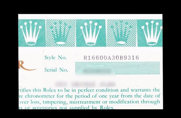 首先在保证书的右上角如果看到一组“Style No.”,代表适用这次教学介绍的技巧,以这间劳力士二手表经销商提出的范例来说,保证书上的Style No.写的是”R16600A30B9316”,一般我们可能看过去就算了,也不会特别多想这组数字和字母有什麼意义,但它并非一组乱码,而是可以拆解成六个部分理解。