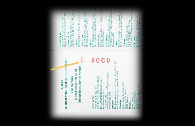 然后再把保证书翻到另外一面,应该会很容易发现在一堆直式文字中会出现一行大大的横式红色文字,市面共有五个字母,以范例上的资讯而言,上面写着的是”L ROCO”,看起来很像是什麼文字机密,不过熟悉劳力士手表的人一看就能看出裡面的端倪。