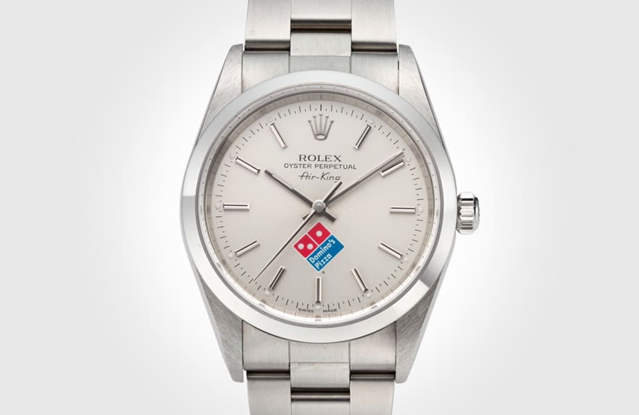 Air-King 14000持续生产到2007年左右,期间劳力士曾推出过许多款式,而在收藏家眼中别具赏玩意义的经典之作,要属一款Domino's Pizza达美乐比萨订制版。这款表据知是1998年时,达美乐为了要奖励旗下业绩达标的分店,而向劳力士所订制的专属奖品。