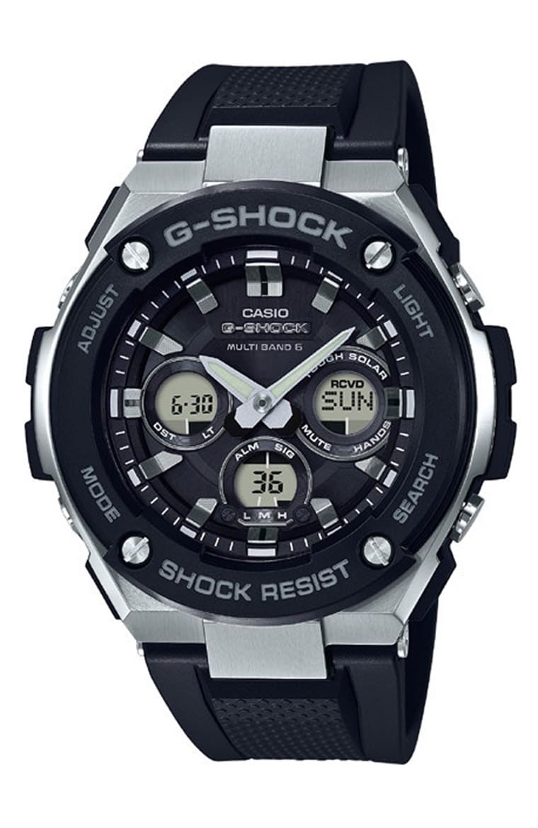 表款採用黑色树脂表圈搭配不锈钢中壳相结合,营造出石英表较少呈现的高级感。GST-W300-1AJF的精准度超越一般石英表,因为它可以接收来自世界6局(包含日本2个电波塔、中国、美国、英国、德国等)的标准无线电波并自动调校时间,在夜间透过自动接收功能确保时间正确无误(每天最多6次自动校正)。