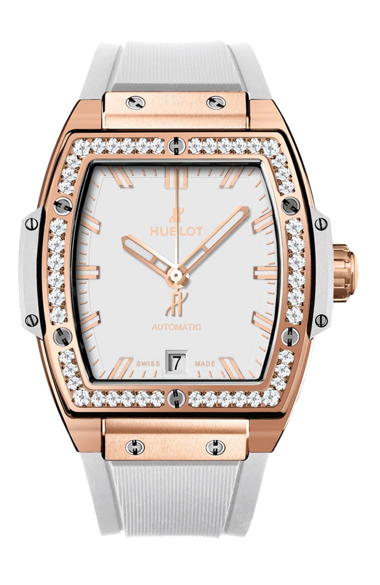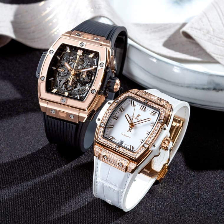 Sprit of Big Bang系列着名的酒桶外型搭配皇金材质、不同功能乃至不同配色的设计刚好象徵个性看似迥异的两人,其实也有着紧密的连结。白色简约三针与女性刚毅柔美的气质互相呼应,而黑色镂空复杂面盘则是突显男性直率大气的风范,两者的自我个性藉由酒桶表壳的统一设计,让人找到彼此相系的重要理由。