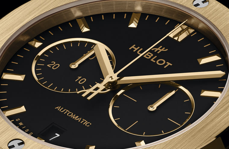 经典融合黄金计时码表的面盘很务实地选择了黑色,而没有加上其他装饰,黑色与金色的组合一向在时尚圈备受欢迎,既经典且不褪流行,黑色可以中和黄金光泽的高调感,因此一看到黑金组合,往往会让人想到「低调奢华」这样的风格。宇舶在黑色面盘加上迷人的金色细节,如立体几何造型时标、计时小表盘的金色外框,同时像是12点方向的品牌Logo与6点方向的”AUTOMATIC”字样也都以金色呈现,最后再搭配金色的剑形指针,黑色的深沉对比金色的亮眼,腕表的显时效果一览无遗,展现贵气之餘仍旧不失腕表便于人们清晰读时的创作初衷。