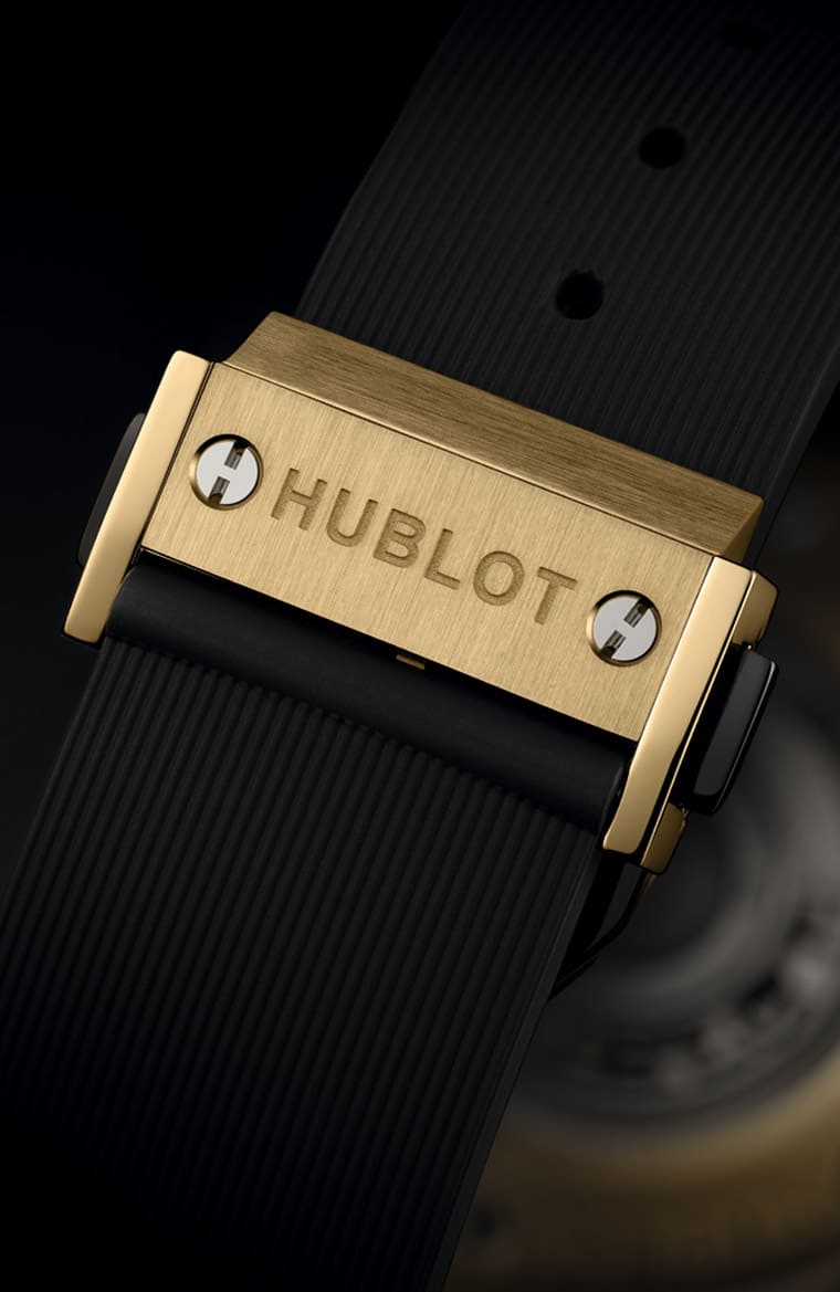 宇舶替腕表配置黑色立体条纹橡胶表带——经典材质组合彷彿引领佩戴者回到1980年代,黑色橡胶表带呼应了表壳中层材质与面盘顏色,佩戴上手带来贴合舒适的感受外,其同样也能衬托黄金表壳的耀眼光芒。而当佩戴者要穿脱腕表时,会欣喜地发现表带搭配的折叠扣同样採用黄金材质(两色开锁按把则为黑色镀层钛金属),表扣设计让人想起腕表表耳间的延伸空间,带有俐落的折角线条,而且宇舶也贴心地在较容易产生摩擦与刮痕的表面採用拉丝处理,此处同样所上两枚H形螺丝,并且刻上HUBLOT字样,细节中展现品牌的用心与坚持。
