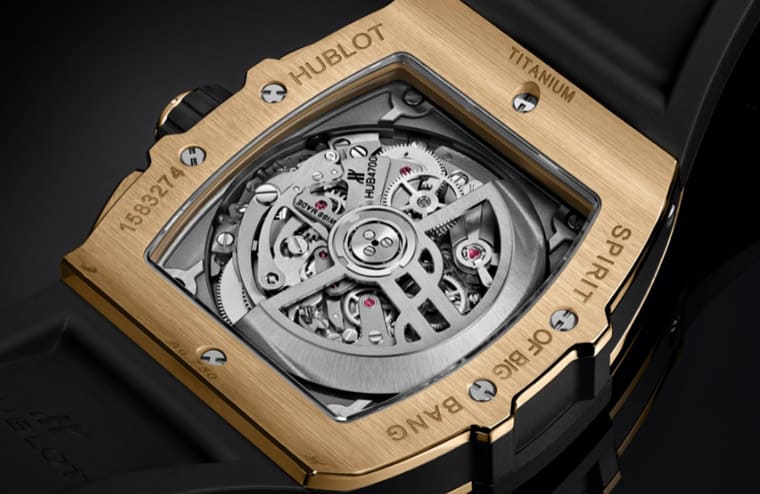 Spirit of Big Bang黄金计时码表搭载系列常见的HUB4700自动上链机芯,宇舶採取透明底盖设计让人可以尽情欣赏透视的机械之美。这款机芯为HUBLOT与ZENITH共同开发而成,以配备日期显示的ZENITH极富传奇色彩的El Primero计时码表为基础(震频5赫兹、即36,000次/时;机芯由278枚零件组成,宝石数量31颗)。HUB4700机芯的原型曾被不少人认为是最具代表性的瑞士计时机芯之一,宇舶将其结构及最后细节进行改造,最终塑造出充满品牌风格并且拥有50小时动力储存的优质机芯,例如机芯的镂空自动盘就拥有融入品牌H Logo的样式,让人一眼便能看懂其源自品牌的制表血统。