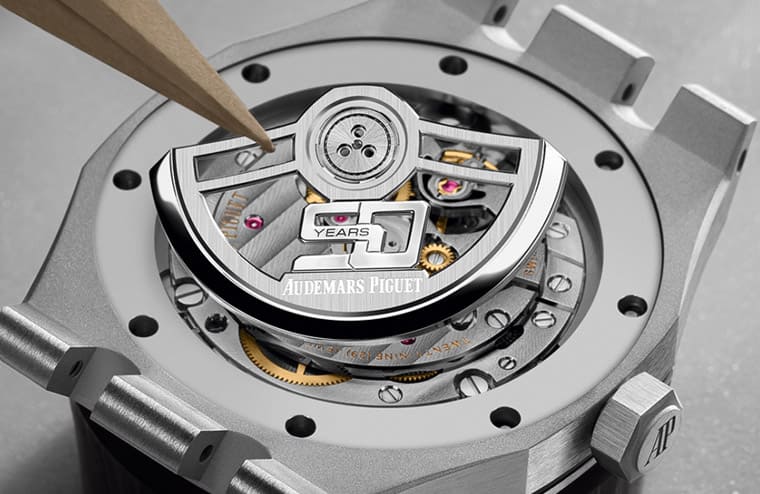 ▲37mm皇家橡树自动表搭载AP崭新开发的5900机芯,其K金自动盘拥有50周年限定造型。