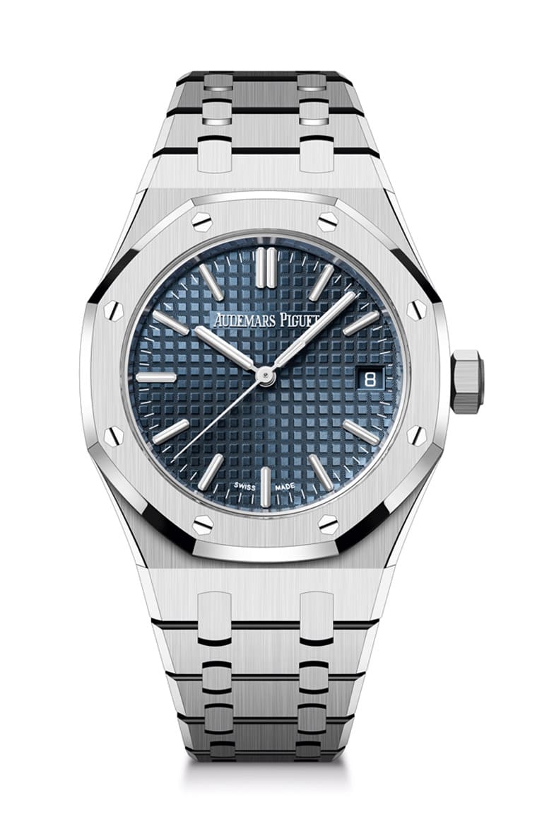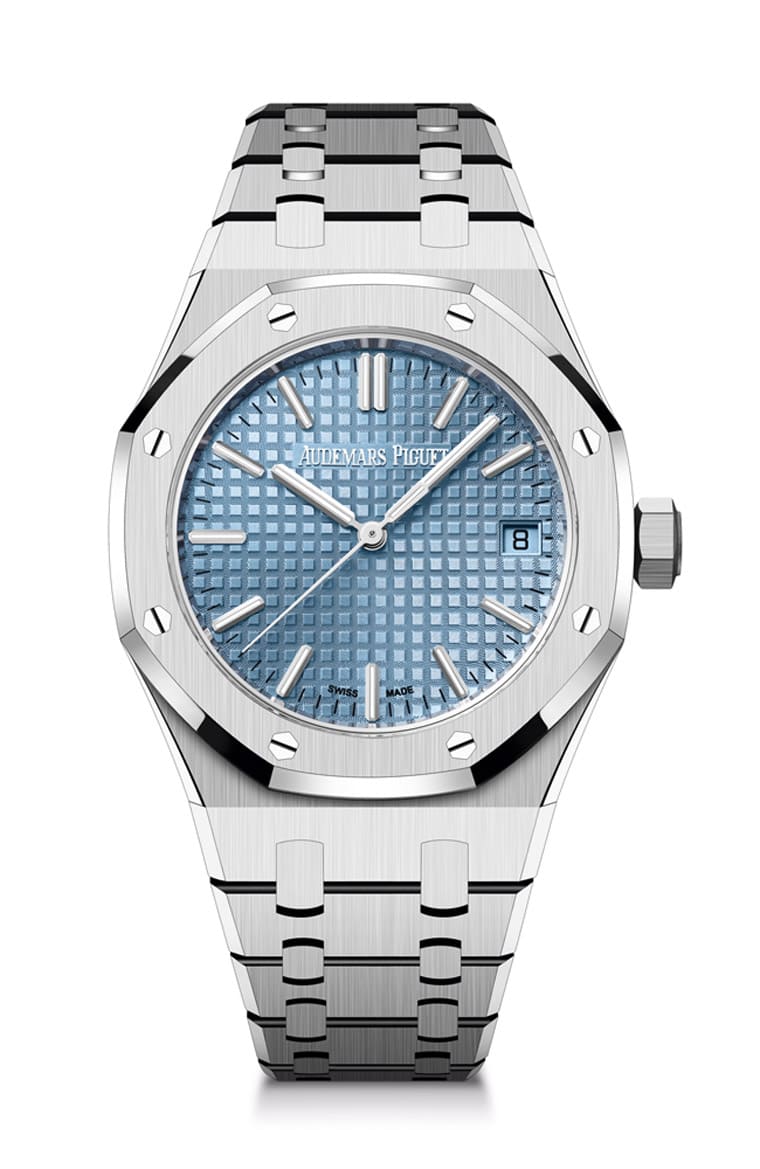 37mm皇家橡树自动表款式非常丰富,有精钢、精钢/玫瑰金双材质、表圈镶钻款式、玫瑰金材质等等,同时手表的面盘顏色也很多变,从银色、云夜蓝50色、浅蓝色到绿色应有尽有,满足每个人对于理想手表雏型的渴望。