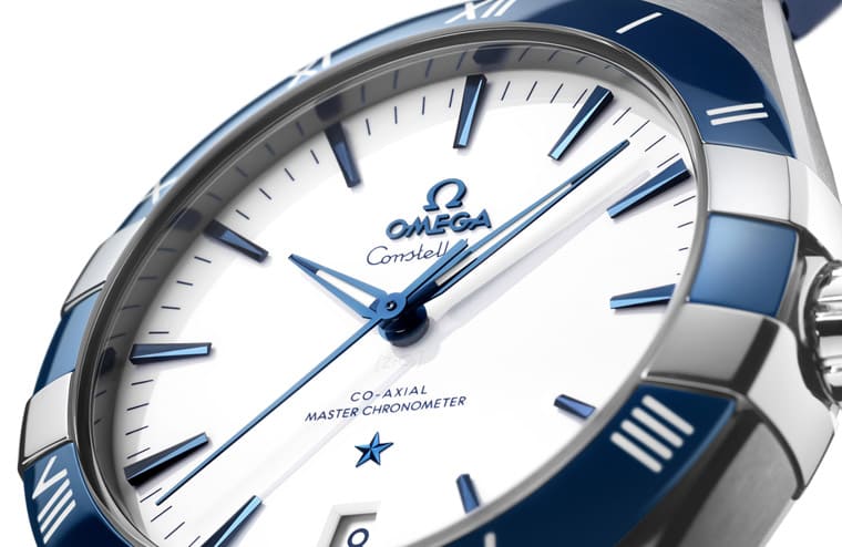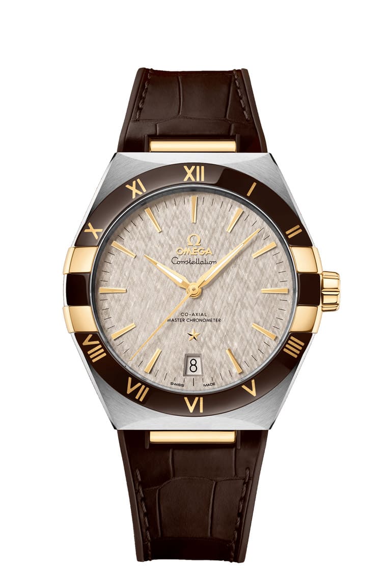 欧米茄新推出的Constellation星座系列大三针分别有不锈钢、不锈钢和18K黄金、以及不锈钢和18K Sedna™金材质等组合,其中不锈钢款配置蓝色陶瓷表圈,K金与不锈钢款则是搭配咖啡色或黑色陶瓷表圈,而咖啡色陶瓷圈又是这次星座系列大三针新增的元素。一般来说採用陶瓷表圈的作品整枚表圈都会是陶瓷,不过星座系列拥有招牌的扣爪设计,使得它的陶瓷圈会呈现与金属交错的独特造型,欧米茄还在表圈上的罗马数字时标填上白色珐琅或Ceragold™瓷金强化整体的质感。