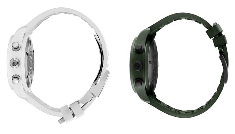 「森林地」特别版的设计灵感则源是自海军飞行员的飞行服。森林地绿色用于陶瓷表壳和面盘,数字及时标则是较浅的绿色。表款的按把和表冠以雾面黑Ceratanium®(瓷化钛金属)制成。这种由IWC经历五年研发而成的物料,特色在于有钛金属的轻盈与结构完整性,也像陶瓷一样坚硬、抗刮。手表搭配带有织物内衬的绿色橡胶表带,形成一致的整体感。