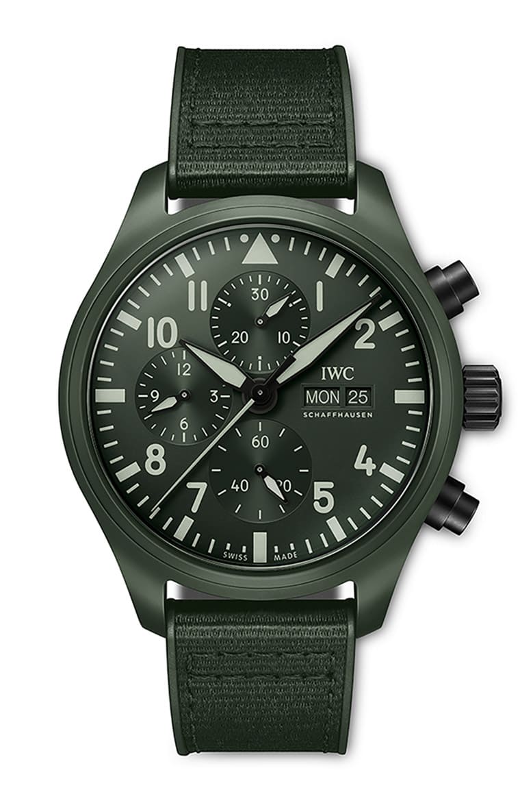 IWC万国表2022年推出两款飞行员系列Top Gun海军空战部队彩色陶瓷计时码表。包括「太浩湖」特别版(IW389105)採用白色陶瓷表壳与黑色面盘,而「森林地」特别版(IW389106)则是以深绿色陶瓷表壳和面盘示人。