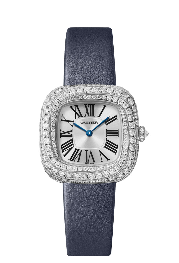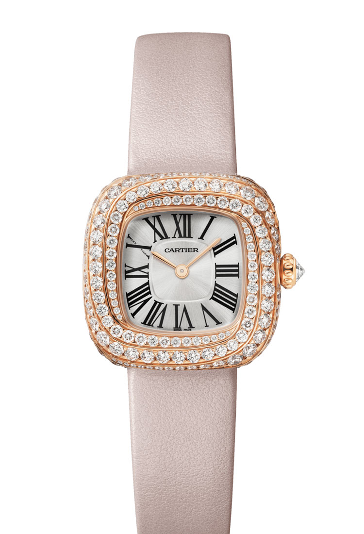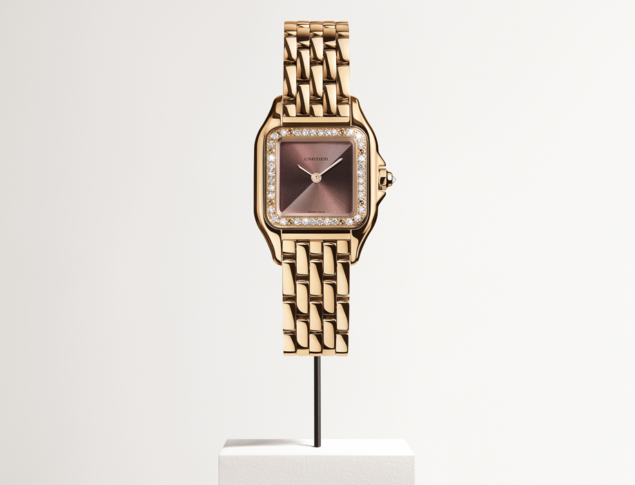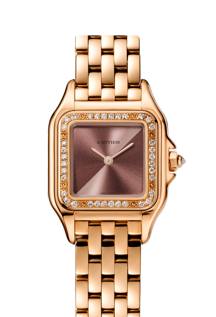 Panthère系列此次新品皆为搭载石英机芯的小型款,卡地亚分别以玫瑰金、黄金与不锈钢制作表壳,搭配四种色调的缎面打磨面盘,包括金褐色、金色、蓝色与黑色等,让手表的简约线条与功能散发富有深浅变化的光影魅力。其中玫瑰金款和不锈钢蓝面款的表圈街香有36颗美钻,前者的表冠同样镶上1颗钻石,华丽耀目的钻石镶饰与系列着名的拋光弧形链节搭配显得相得益彰;虽然系列是女表定位,但是手表整体散发如同美洲豹般的敏捷灵巧风格却是令人一见倾心。