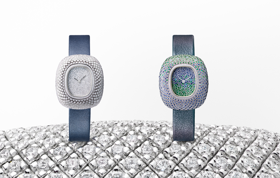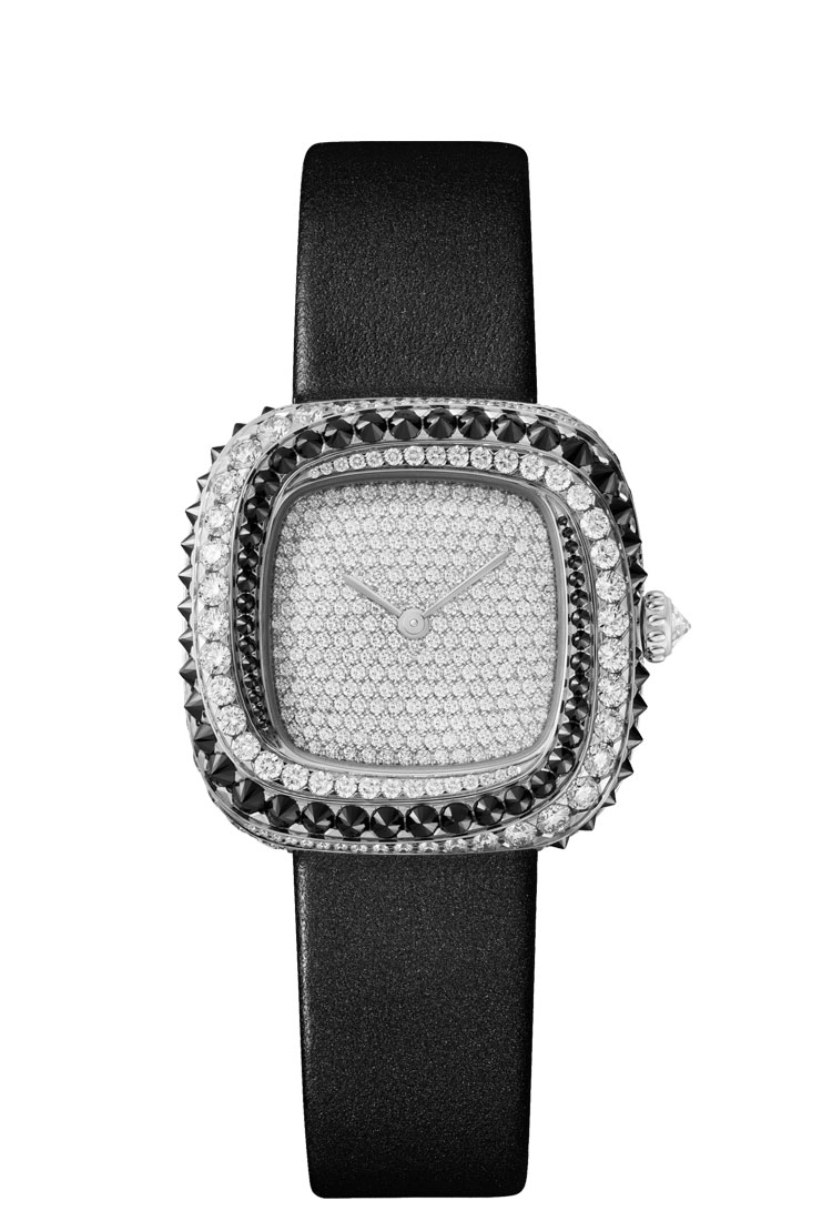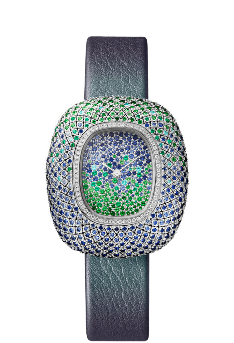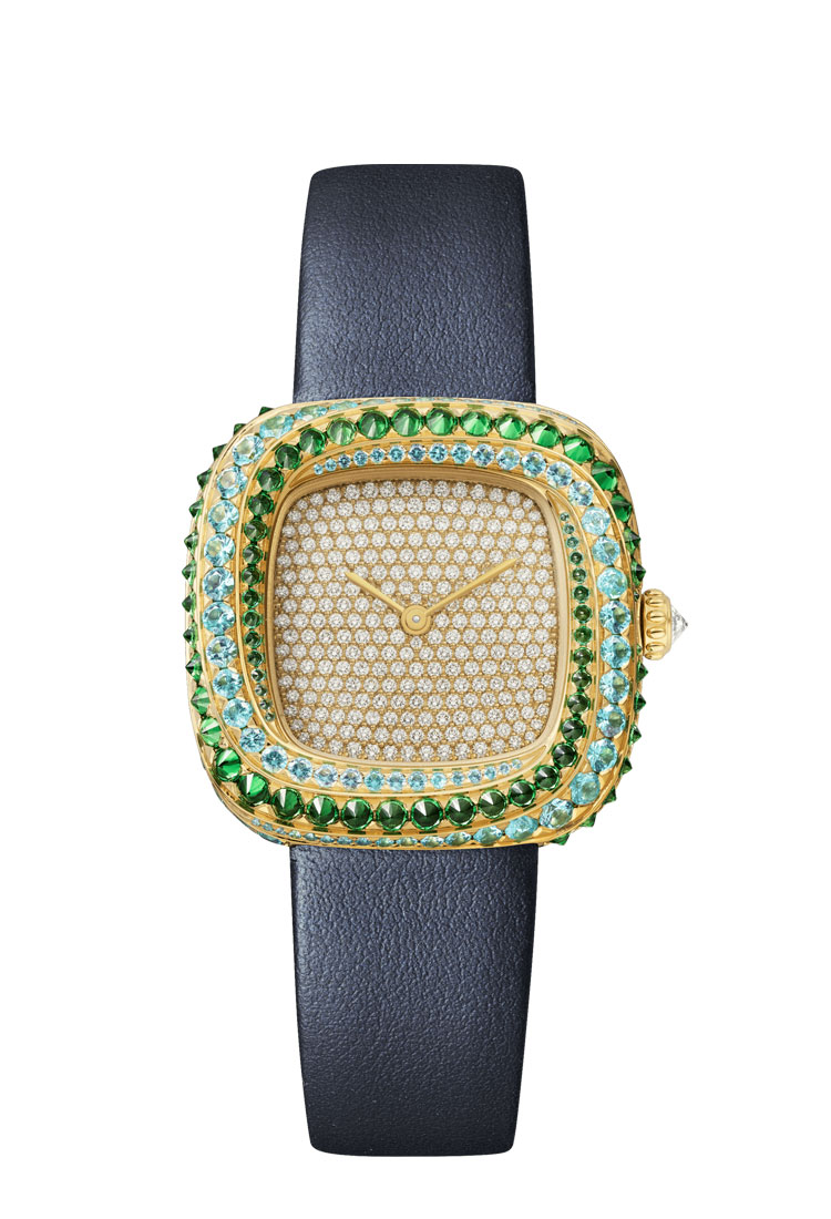 表款以多重枕形线条组成,包括面盘与表壳,以及厚实的表圈都充满枕形轮廓,有意思的是,表圈的枕形轮阔并非呈放射状,而是由面盘往外扩散的漩涡状,因此手表表壳的钻石镶嵌就会遇到由枕形线条组成的夹角地带,针对表壳造型的特色,卡地亚独创三角形镶嵌,以类似隐形镶嵌的方式,不需透过镶爪即可将钻石固定于表壳上。Coussin系列除了一般版(上图),还有两款分别限量20只的特别版(下图),这两款除了表壳尺寸更大,形状也较接近矩形,且表壳上的钻石与宝石乃是镶在K金格网上,这样的创新结构让表壳上的钻石可以小幅摆动并在静止时恢复原位,制作过程比Coussin一般版更复杂费时。