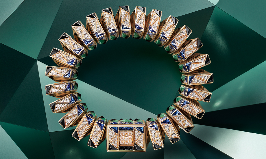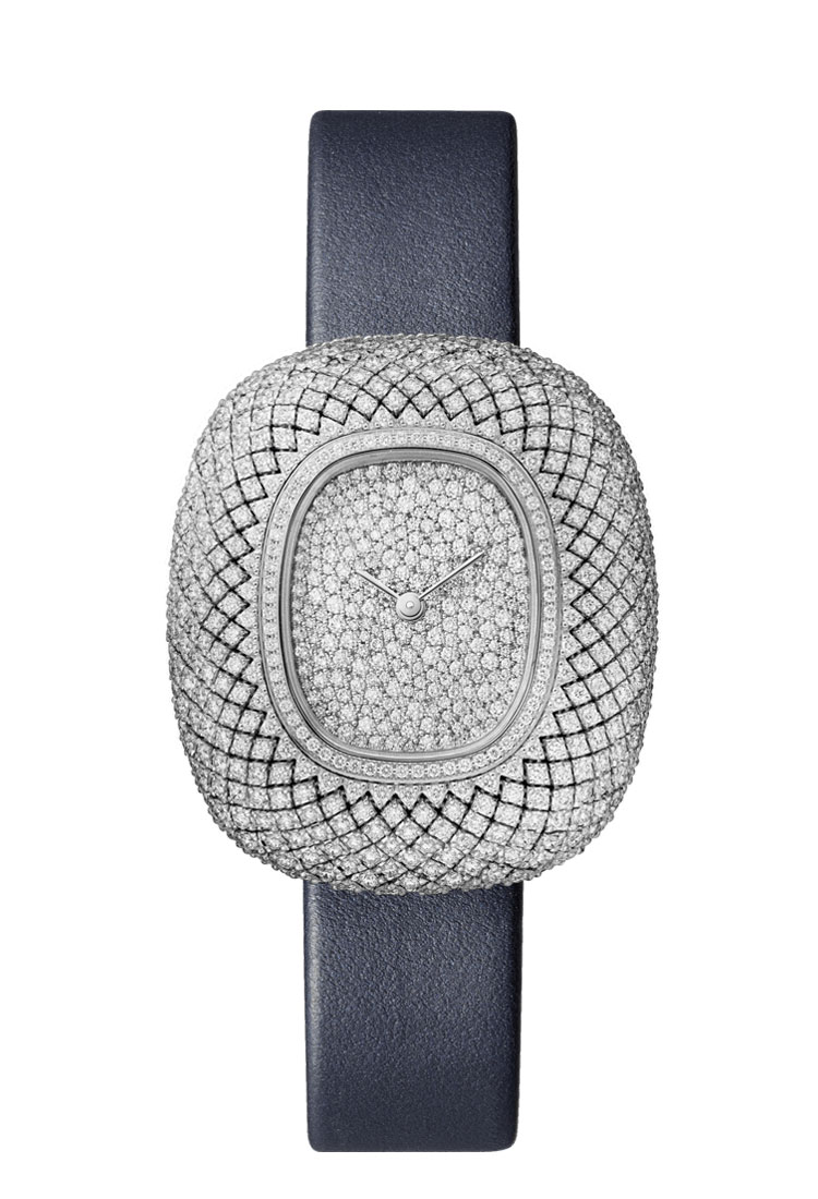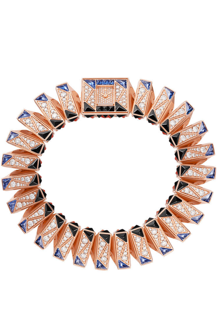 Libre表如其名,第一眼你可能会以为它是手鐲之类的饰品,实际上卡地亚是从20世纪知名女星Gloria Swanson拥有的钻石手环获得灵感,打造出又是手鐲又是手表的创意之作。表款的表头採双面设计,由于手鐲的链节之间有弹簧装置,使其可以正反面翻转自如,一面是手表面盘,背面则与手鐲上其他链节无异,且品牌还巧妙将调时机制设在隐蔽的位置,以避免影响手表整体线条的流畅度。这款表表面同样带有宝石或钻石装饰,卡地亚于此也採用Coussin出现的三角形镶嵌,展现珠宝行家的工艺风范。