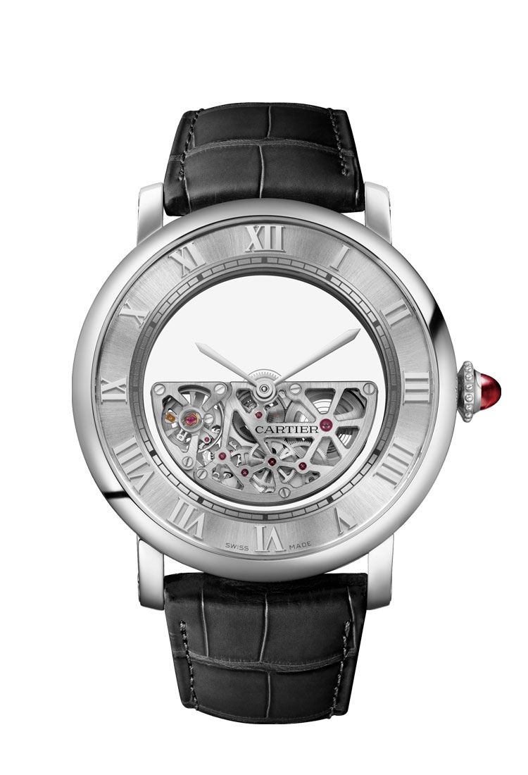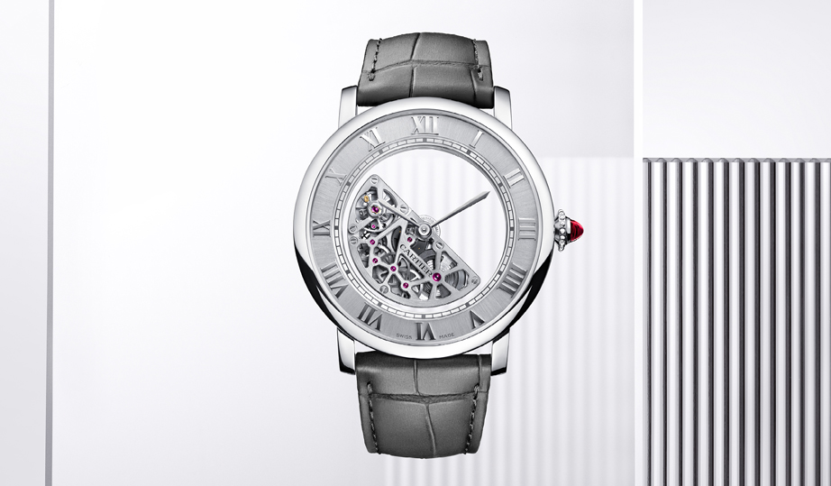 每当看到卡地亚的高级制表系列登场,就知道一定会有精彩可期。2022年品牌推出的Masse Mystérieuse虽然主要概念还是高级制表系列曾多次运用的神祕钟原理,但是这次手表的神祕感变得更强烈了,原因就在于卡地亚直接把镂空自动盘与机芯相结合,因此在手表43.5mm硕大的铂金表壳中,除了面盘外围的罗马数字时标外,只见中央的时、分指针以及彷彿悬在面盘上的自动盘(机芯)在灵活转动。品牌前后花了8年时间才成功打造出手表搭载的9801 MC自动机芯,最特别的地方莫过于自动盘的半圆形范围融入机芯传动轮系与调校装置,而为了避免自动盘随着佩戴者手表活动而摆动时影响到指针运转,因此机芯结构设有差动装置可以让指针不被自动盘旋转所干扰,看起来简约,但其中蕴含的工艺细腻度与巧思,却是让人叹为观止。